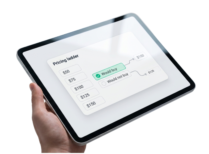 This back-and-forth continues until the respondent’s maximum willingness to pay (WTP) is revealed. By isolating one price per screen, it avoids bias from comparisons and captures clean, reliable demand data.