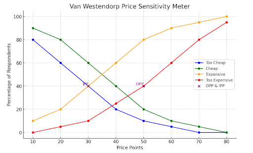 Figure: Example of a Van Westendorp Price Sensitivity Meter plot. The four lines show the percentage of respondents who feel the price is “Too Cheap” (blue), “Cheap/Good Value” (green), “Expensive” (orange), or “Too Expensive” (red) at various price points. Key intersections are marked: the point where the “Expensive” and “Too Cheap” lines cross is the Indifference Price Point (IPP), and where the “Cheap” and “Too Expensive” lines cross is the Optimal Price Point (OPP). In this example, the OPP (around $40) is the price at which the highest percentage of customers find the price acceptable, while the IPP (around $30) is the point where sentiment shifts from cheap to expensive .